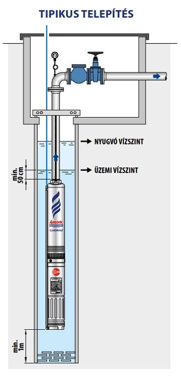 Telepítésekor a szivattyút a víz szintje alá minimum 0,5 méterre kell elhelyezni (maximum 60 méter mélyre) úgy, hogy a motorja ne legyen közelebb a kút aljához 1 méternél.
